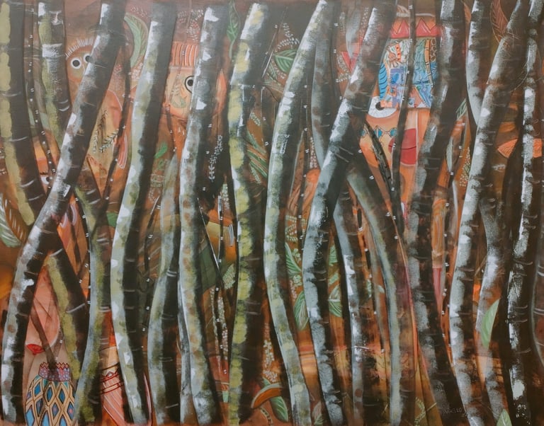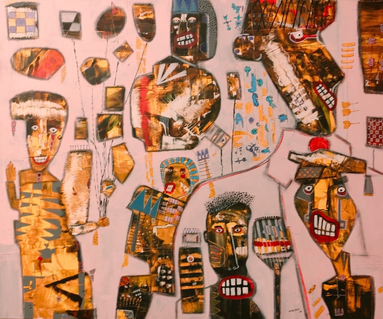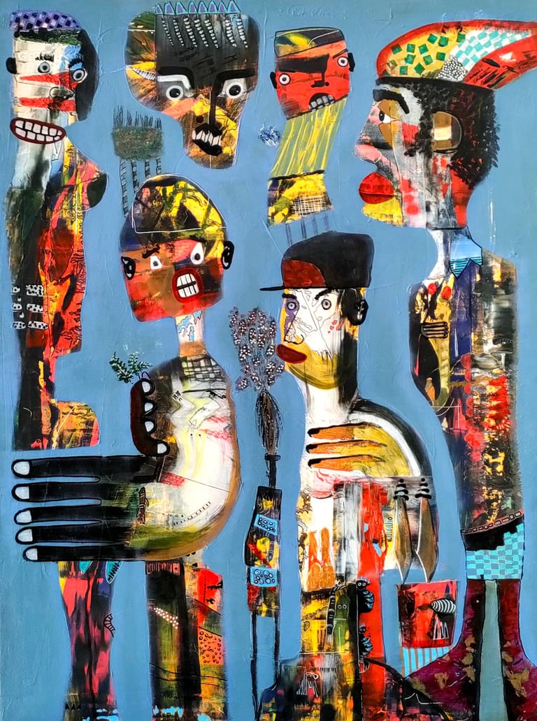 El conjunto sugiere una composición coral: una comunidad de presencias estáticas pero intensamente expresivas, detenidas en el tiempo, como si observaran en silencio desde el fondo de la historia. La obra transmite una mezcla de calma y misterio, entre lo ancestral y lo moderno, entre el gesto humano y la abstracción.
