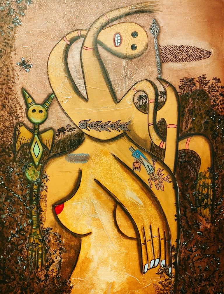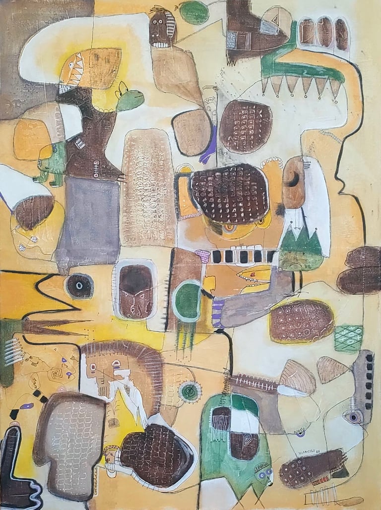Evoca la conexión ancestral con la tierra, los tonos ocres, los verdes apagados y las formas primitivas que parecen grabadas en piedra o arcilla.